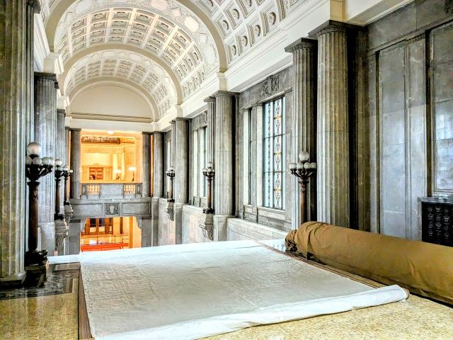 そんな衛視さんは、講和会議の場所でもあったため戦前の建築でありながら金属の手すりが残る階段、1mあたり23,000円もするという赤絨毯、200mに及ぶ廊下、沖縄産の珊瑚石灰石の壁など、様々なポイントを紹介してくれます。