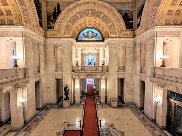 1階部分に立つのは伊藤博文の銅像。ここからは真下であるため見えませんが、大隈重信と板垣退助も配置されています。それぞれ広間の四隅ですが、一か所だけは空座となっています。政治に完成はないためあえて開けておくという未完の象徴であるという意味や、未来のために一席空けてあるという説もあるそうです。また、空座のところに像を立てると皇居におしりを向けることになるため不敬になるともいわれています。