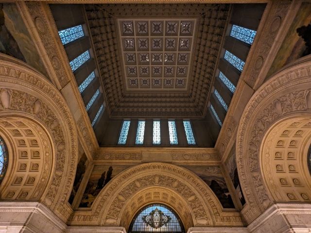 この広間は2階~6階まで吹き抜けとなっており、その高さは32mにも及びます。