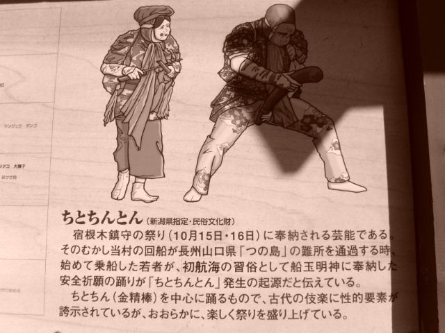 こちらは「ちとちんとん」と呼ばれる伝統芸能の1つで、男根をモチーフにした木の棒を振り回す男性役の「ちとちん」と女性役の「とん」、そしてお囃子隊などで構成されています。毎年10月15日,16日に行われる宿根木鎮守の祭りにて、五穀豊穣を祈るため奉納されているそうです。