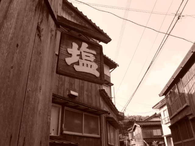さきほどの三角家、よく見ると「塩」の看板が取り付けられています。かつて塩販売を営んでいたようです。