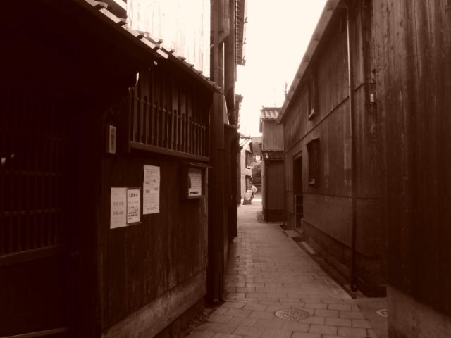 そんなわけで何となくセピアなフィルターをかけて写真を撮ってみたところ、立ち並ぶ木造家屋と相性がぴったり。物凄く雰囲気に合います。