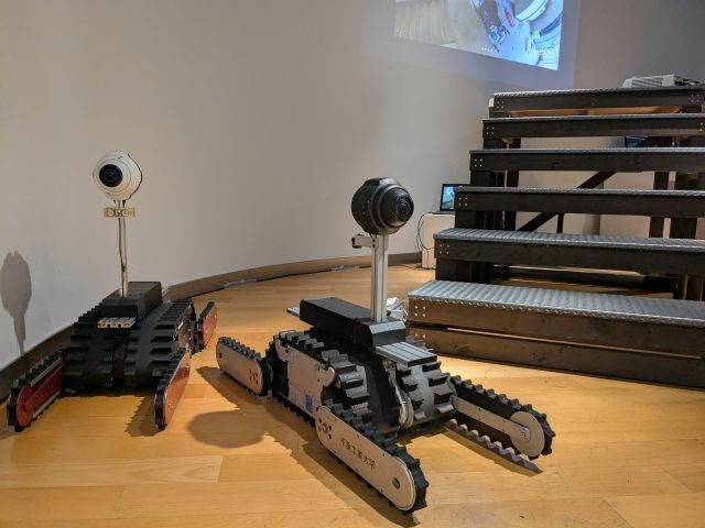 人が入れないところに入り、カメラで内部を撮影できるレスキューロボット。ベルト式で、最大42度までの階段も登ることができます。福島原発内の調査や、熊本地震で崩壊した市役所内部にて活躍したそう。