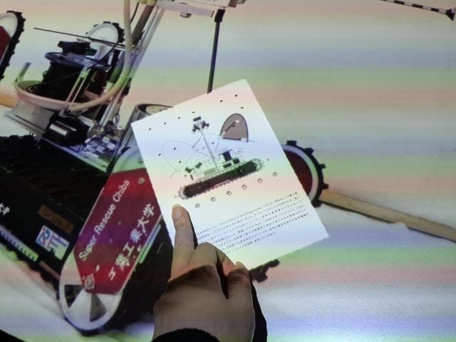 実際にテクノロジーを体感することができる展示もあります。こちらの魔法のカードはただの紙であるのに、台の上に置くとコントローラーに早代わり。どの穴を押さえるかで様々な映像が映し出されます。