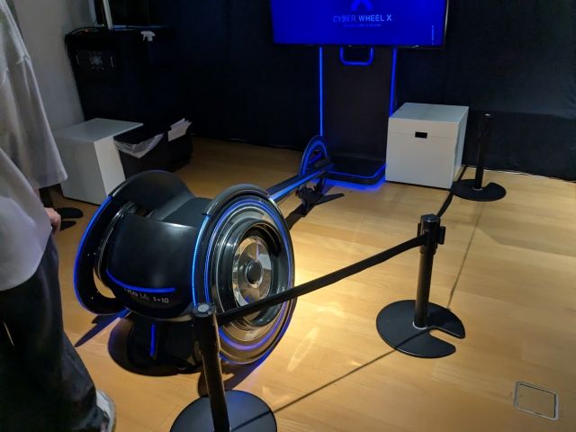 車いすによるレースを体験できるVRエンターテイメント、CYBER WHEEL X。コースのアップダウンに合わせてハンドル操作の重さが変わるそうです。