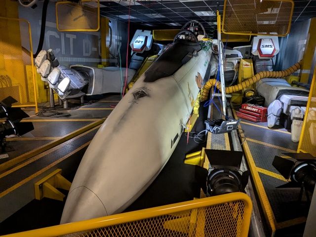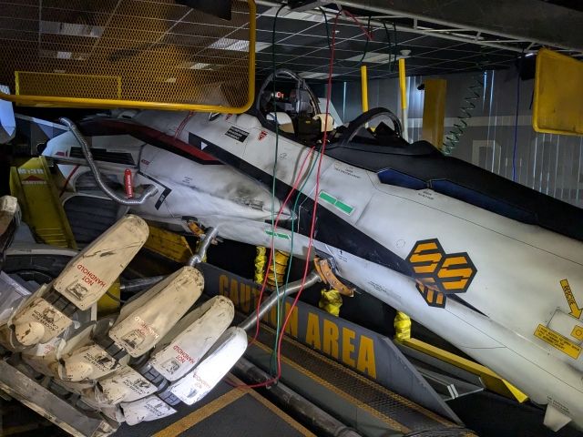 鎮座する巨大な戦闘機は、実物大のバルキリーVF-25F。バルキリーというのはアニメ「マクロス」シリーズに登場するロボットの総称です。この機体は、マクロスFで主人公・早乙女アルトの愛機として活躍したもの。