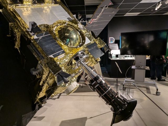キラキラに輝くはやぶさ2の実物大模型も展示されています。レーザ高度計、中間赤外カメラ、サンプリング装置など、多くの科学観測器を搭載しており、ものすごく多機能な機器であることがわかります。