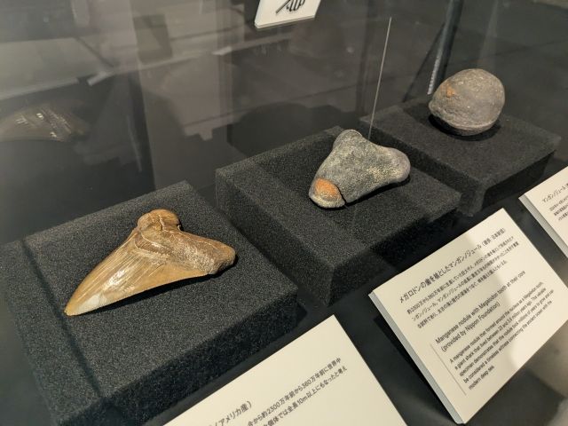左が「メガロドンの歯の化石」、右が「マンガンノジュール」、真ん中が「メガロドンの歯を核としたマンガンノジュール」。マンガンノジュールというのは、南鳥島周辺の深海底で見つかっている海底鉱物資源。リチウムイオン電池に欠かせないコバルトやニッケルを豊富に含んでいるそうです。