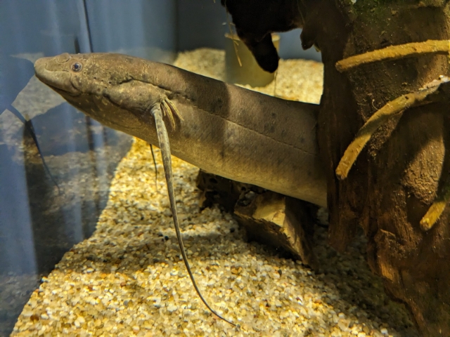 木に隠れているのはプロトプテルス・アネクテンス。肺のような機能の鰾(うきぶくろ)を持つ、いわゆる肺魚(ハイギョ)と呼ばれるサカナです。アフリカに暮らす肺魚は、乾季には泥の中で繭を作って休眠するというから驚きです。