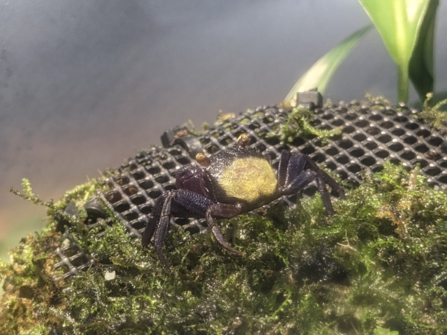 背中が黄色いカニはバンパイアクラブ。インドネシアに暮らす淡水性のカニです。小ぶりですが、真っ黒なカラダと鮮やかなイエローの模様にわずかなモンスター感があります。