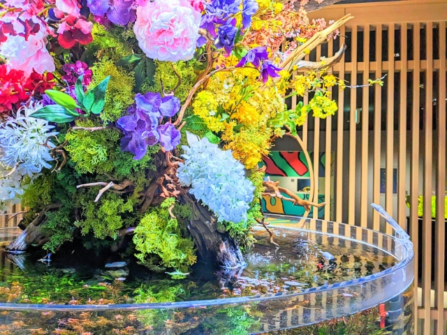 「NAGOMU(和む)」エリアでは、色鮮やかな生け花が盛り盛りな水槽も。和モダンな雰囲気は、アートアクアリウムにも通ずる華やかさです。
