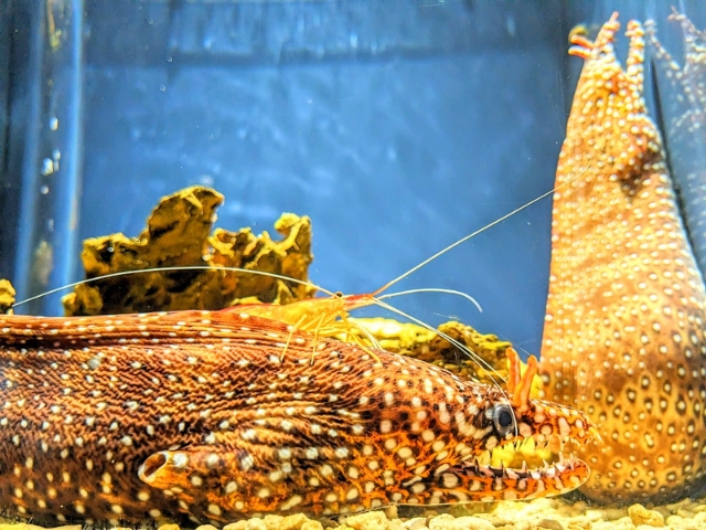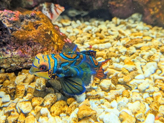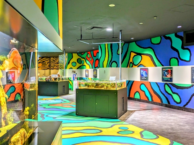 展示されている生き物も、色鮮やかなものが多数。こちらの色鮮やかなサカナはニシキテグリ。カエルみたいな顔と模様をしたユニークな姿。ヒョコヒョコ動く様子は、ずっと見ていたくなります。あれ、先ほどのウォールペイント、もしかしてこのサカナがテーマだったのでは・・・?
