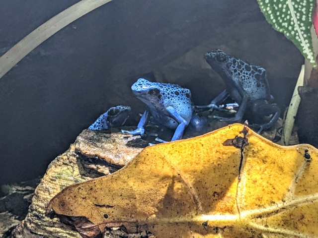 色鮮やかなコバルトヤドクガエル。猛毒を持つカエルですが、その毒は自らが生成しているわけではなく食料のアリから蓄積されていくそう。そのため、アリ以外で飼育すれば無毒になるそうです。