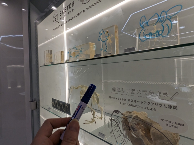 ずらりと並ぶのは骨格標本。ペンが備えられており、骨から推測できる生き物を直接ガラスケースに書くことができます。