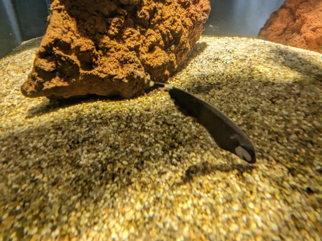 まるで黒い羽根ペンみたいなブラックゴースト。つねにふよふよと動いており、前進だけでなく後退もする不思議なサカナ。動きの予測がつかないため、写真に撮るのは非常に困難。これまで、様々な水族館で見かけてきましたが、いまだかつてちゃんと撮れたことがなく、私の中で「写真に撮りにくい魚ランキング」堂々の1位です。