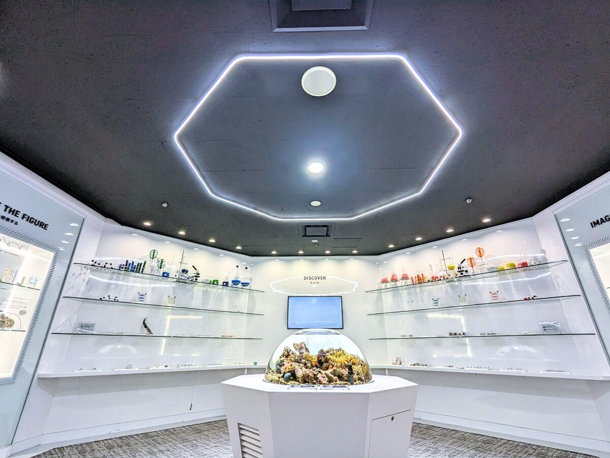 館内は「暮らしに寄り添ったスタイリッシュな水族館」がテーマとのこと。大型水槽などは建物の都合で設置できないため、まるで美術館のような雰囲気に仕上がっています。BGMもリラクゼーション系で心が落ち着く空間です。