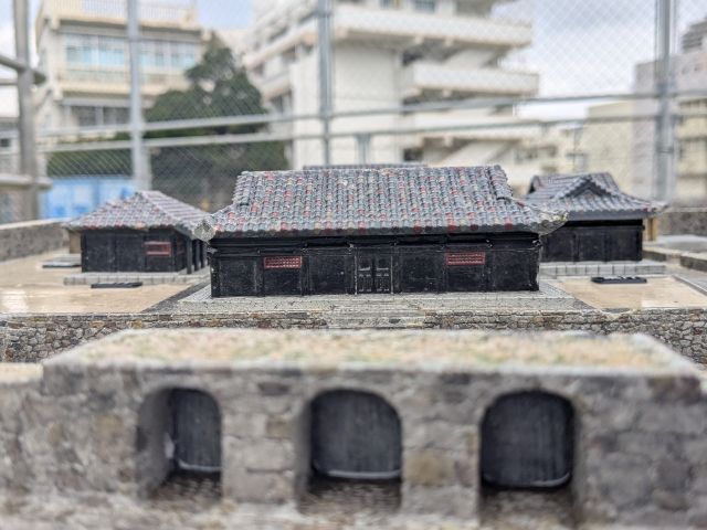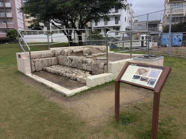 芝生の奥に何かあります!これは崇元寺の遺構とのこと。積まれた石垣、柱を支えていたであろう礎石も見えます。実はこの遺構、発掘調査時の状況を忠実に再現した模型。実物はこの模型の真下に眠っているのです。