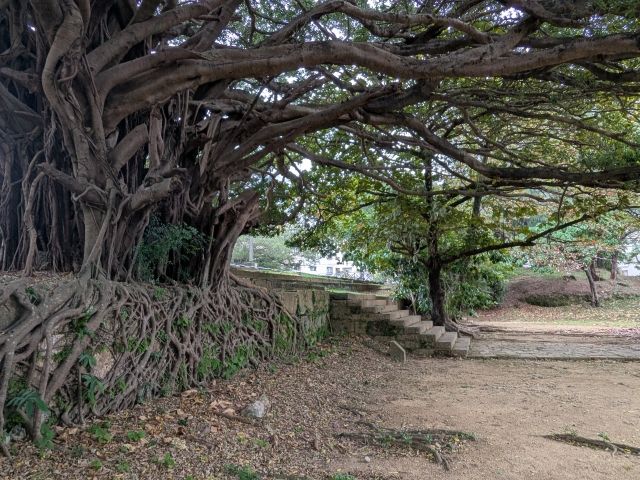 実は、先ほど見かけた模型は2023年と比較的最近設置されたもの。現在もこの寺院跡の保存整備事業は進行形であり、「ガイダンス施設」の設置を進めているそうです。いつかは諸堂が往時の姿に復元される日が来るかもしれませんが、そうなるとちょうど前堂の位置に立っているガジュマルはどうなってしまうのでしょうか。復元は見たいけど、石垣に広がるガジュマルは残してほしいところです。