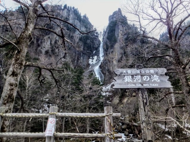 銀河の滝はスライダータイプ。岩肌に沿って優雅に広がるこの滝は別名『雌滝』というそう。