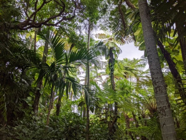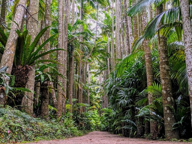 ヤシの木やヒカゲヘゴなど、亜熱帯ならではの森が広がります。こう見ると密林の中を歩いているようですが、散策路は歩きやすく整備されていますので、サンダルでも大丈夫。ただし、蚊はいるので気になる方は虫よけをお忘れなく。