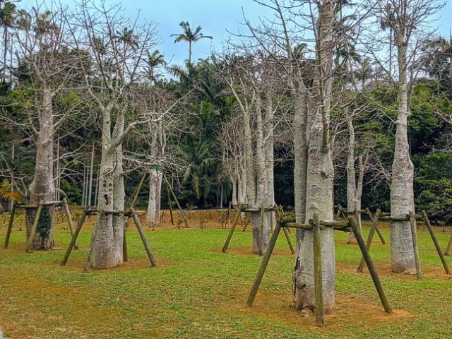 等間隔に植えられた樹木、こちらはなんとバオバブ!アフリカのサバンナのイメージが強い樹木で、ここではマダガスカル産のザーバオバブという種類が植えられています。大きいもので高さは8m、幹周囲は2mにも達しており、威厳を放っています。単体ですら国内では数えるほどしかない樹木ですが、それがこれほどまでたくさん生えているのはスゴイ!