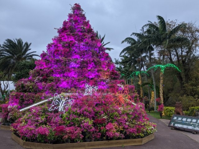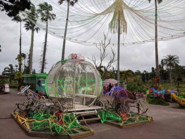 天高くそびえるヤシの並木やヒカゲヘゴ、バオバブなど南の島ならではのラインナップが楽しめる植物園。非常に長い期間に行われる南国イルミネーションも人気なスポットです。昼と夜でチケットが異なるため、今回は夜の部を狙って訪問しました。
