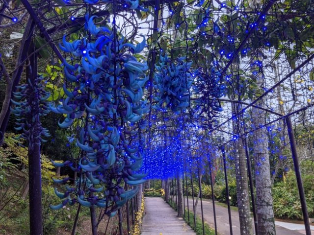 ブルーのライトで彩られた「ヒスイカズラロード」。2月末くらいからは、水色が鮮やかなヒスイカズラの花も見ることができます。