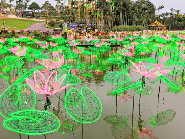 30分ほどで植物園も見終わったので、17:30頃水上楽園へ。こちらは17:00からイルミネーションがスタートしております。