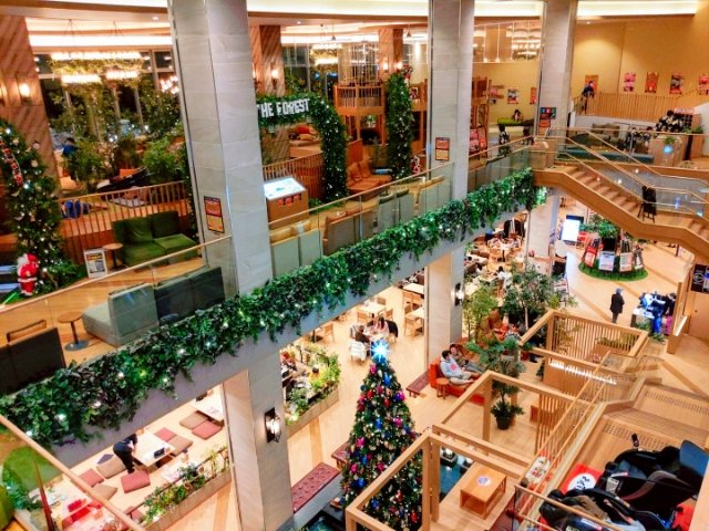 広々とした館内は吹き抜け構造。キラキラとした内装は、まるでホテルのラウンジのようです。
