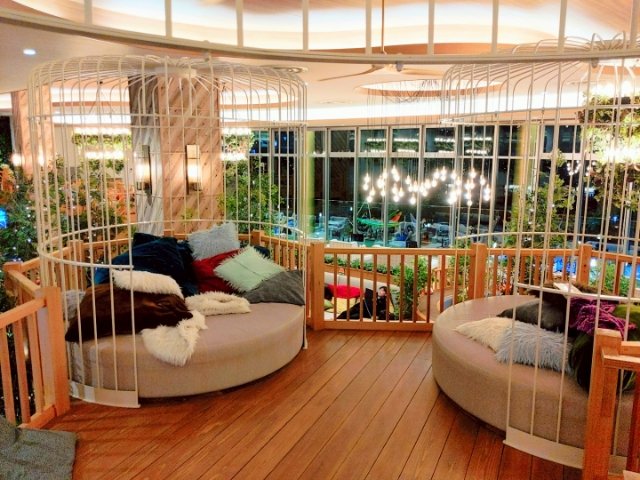 ロフト席も複数設置されています。階段を登ると鳥かごのようなシートも。クッション性抜群のふかふか仕様で、一度寝転んだら最後、そう簡単には立ち上がれなくなってしまいます。なお、ロフト席は高い位置にあるため暖房が効きやすいです。寒がりな方におすすめですが、乾燥にはご注意を。