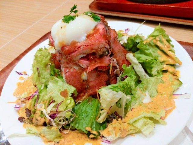 こちらはローストビーフ丼(1,740円)。ローストビーフがたっぷりのって満足感が高いメニュー。温玉とタレが相性ばっちりです。まわりに盛り付けられたサラダも嬉しい。