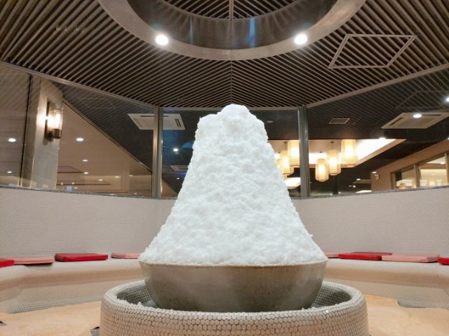 クールダウンするためのコールドハウスには、大きなカキ氷がセット。火照った体を冷やすのに心地よいお部屋です。