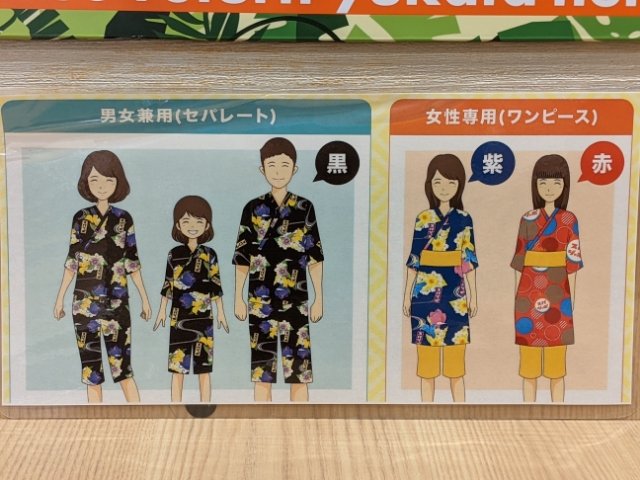 岩盤浴利用の場合は館内着がセット。男女兼用のセパレートタイプが黒と青の2色、女性専用のワンピースタイプが赤と紫の2色と全部で4パターンから選べます。