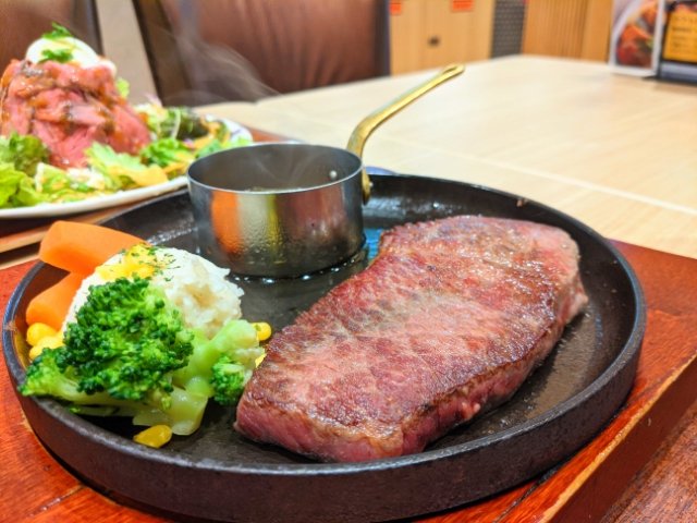 US肩ロースステーキ(1,520円)。ジューシーな一枚肉は食べごたえ抜群!肉の旨味たっぷりです。