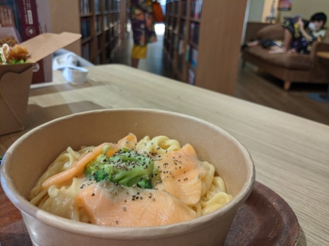 サーモンチーズクリームのパスタ(890円)。もちもちの麺が美味しい!クリームがとろとろなので、ペーパーボウルでも食べやすい。