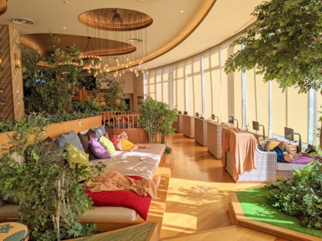 岩盤浴利用者が使えるラウンジには、ごろ寝できるシートがたっぷり。ソファやハンモックなど、極上のくつろぎ空間ができあがっています。お昼ごろになると、大きな窓から太陽が降り注ぎ、スーパーお昼寝スポットができあがります。