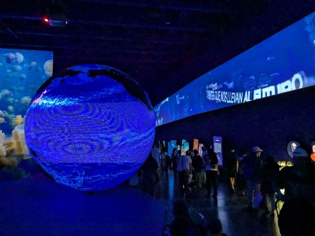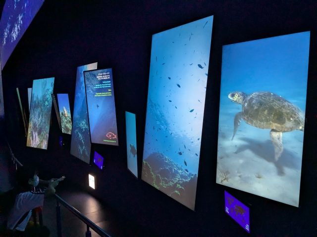 館内に入ると、広いホール状の空間。真っ暗ななか、壁一面のスクリーンに映し出される海中の映像と地球を模した球体がブルーに輝きます。壁には「私たちを未来へ導く流れ」「海洋は癒す」「命を養う海洋」などのメッセージが流れ、神秘的な海中世界を表現。