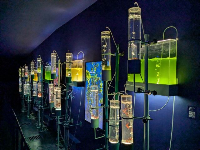 培養ポッドのようなものが並ぶ謎の研究室。海藻みたいなものが入っており、サイネージには「動物の飼料」「化粧品」といった表記が。これには解説が見当たらず、深い内容はわからずです。