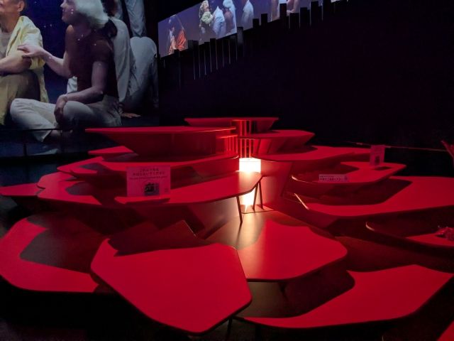 巨大な階段状の建築が目を引くパビリオン。館内には深いブルーの海中世界が広がっています。多様な生き物や、交易など、様々な恵みをもたらす黒潮をテーマにした展示は見応えたっぷり。後半に登場するオレンジの部屋もインパクト抜群です!
