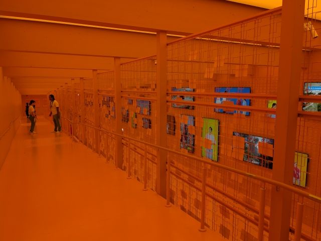 深い海の世界を抜けた先はびっくり!!床も天井も壁も照明も、すべてがオレンジに染まった空間が続きます。薄暗いブルーから来ると、コントラストが強すぎて物凄く眩しく感じますね。