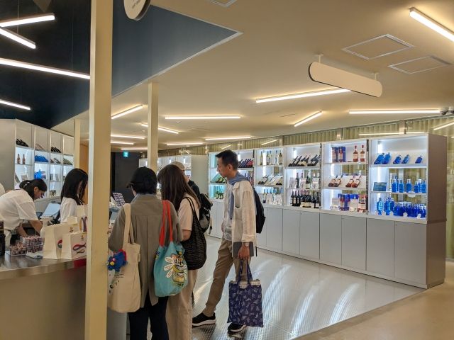 出口にあるのはショップ。スペイン産のワインや、おしゃれな青いボトルに入った水「ソラン・デ・カブラス」などを販売。