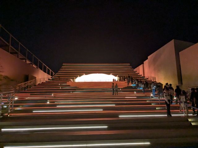 この大階段は大海原を、そして階段の先の空洞は太陽を表しているそうです。日が暮れるとライトアップして、カラフルな姿に早変わり。