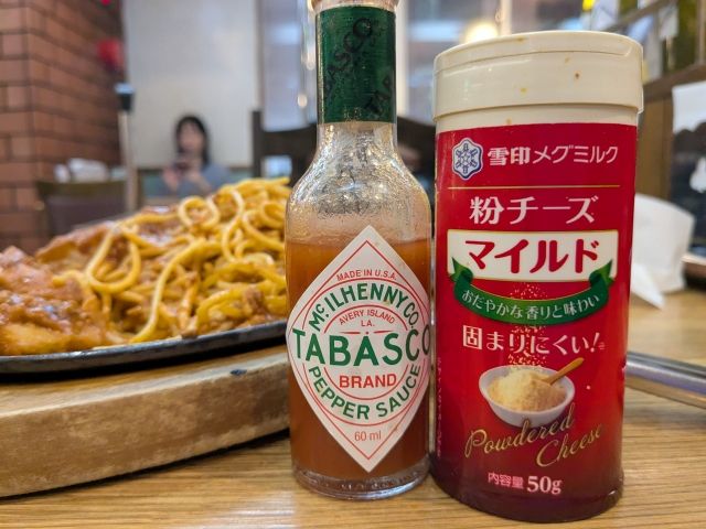 テーブルにはタバスコと粉チーズ。こちらで味変も可能です。