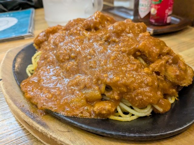 噂通り、鉄板皿にスパゲティが敷かれており、その上に大きなカツが乗っかっています。そしてその上にたっぷりとかかっているソース。鉄板からあふれんばかり、というかあふれています!