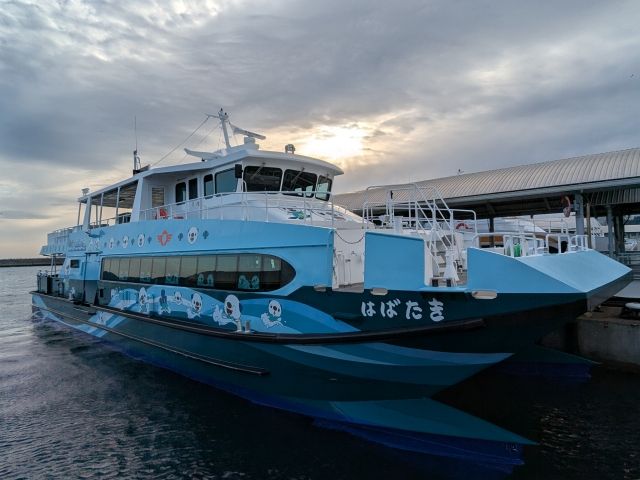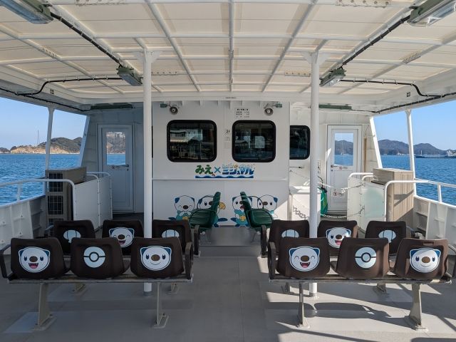今回の船ははばたき。なんと「みえ✕ミジュマル」のラッピング船です!「三重」が「みじゅう」と読めること、おなかの貝が名産の真珠貝のようであることなどから、ミジュマルがみえ応援ポケモンに選ばれているのです。