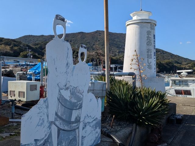 菅島灯台を模したモニュメントとともに、色褪せた海女さんの顔ハメパネルも。この島は海女さんが多いことでも知られています。