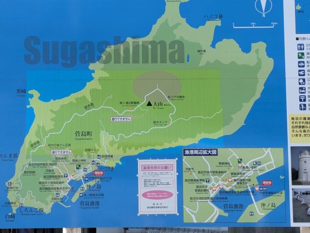 島内は平地が少なく、ほとんどが山。集落や見どころは、島の北東部に集中しております。美しいビーチ「しろんご浜」や歴史ある洋式灯台「菅島灯台」、戦争遺跡の「監的哨」などが気になります。