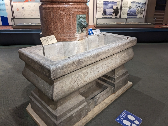 明治39年にロンドン市牛馬給水槽協会から贈られた馬水槽(ばすいそう)。最初は東京府庁舎前に、その後は水道局庁舎に設置されました。手前の水槽は牛馬用、よく見ると下には犬猫用の水槽が、さらに裏側に人間用の水飲み場があります。