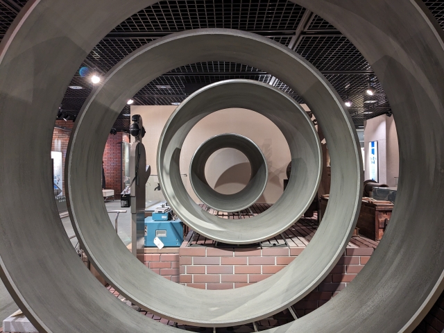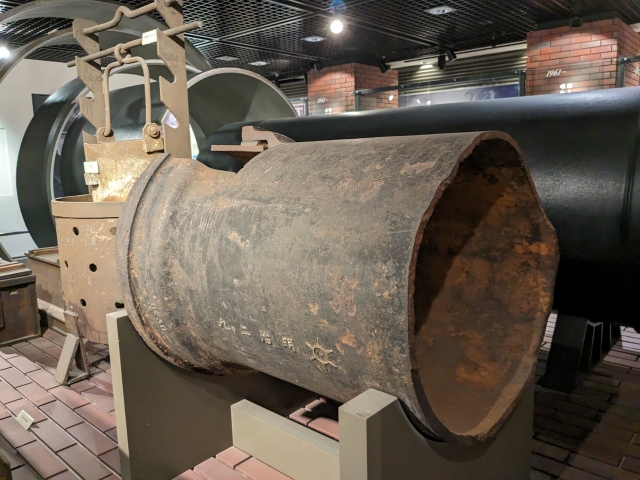 こちらのアート作品のようなものは、800mm〜2,900mmという各サイズの水道管の断面。手前の一番大きなものは、鋳鉄製では日本最大級であるそう。羽村取水堰から村山・山口貯水池までの導水管に使用されているとのことです。