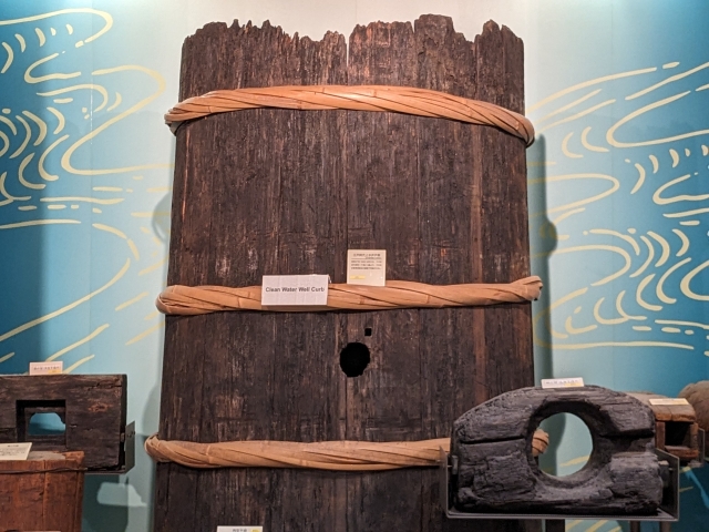 この大きな木の枠は、千代田区にて発掘された上水井戸。たくさんの木の板が組み合わされて、大きな井戸を造り上げています。